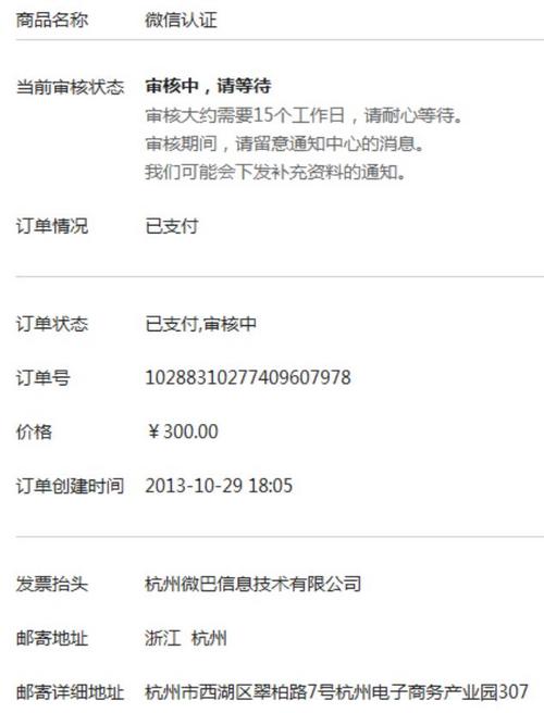 2.300元的认证服务费只能通过微信支付来实现,并且支付成功后最多需要15天的审核期。以下是微巴科技服务号(wbkj66)的认证申请截图。